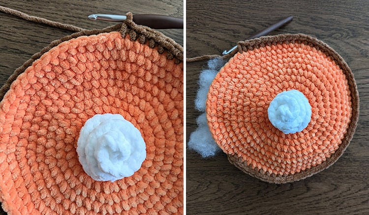 Round 1: Attach the yarn to any of the stitches, ch 1 and sc in the same st, work 1 sc in each st around, attaching the filling and crust. Before you close the pie, stuff it to your preference. After stuffing, continue to close the piece. (72 sts)